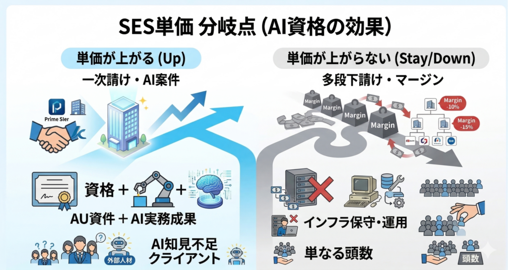 AI資格を取ればSESの単価が上がる――そう期待して勉強を始める人は多いですが、現実はそこまでシンプルではありません。この記事では「AI資格がSESの現場でどう評価され、どんな条件が揃えば単価に反映されるのか」を、スキルシートの通過率・資格別の単価レンジ・単価が動く分岐点の3つの切り口で整理します。
